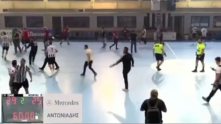 Selanik'teki Mikra 3 Spor Salonu'nda tribünlerden bazı taraftarların sahaya yönelik saldırı girişiminde bulunduğu görüldü.