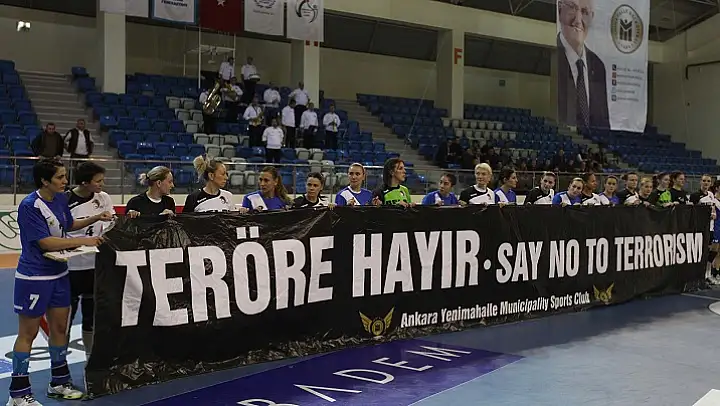 HENTBOLHABER.NET- Yenimahalle Belediyesi SK’nın müsabaka öncesi açtığı pankart büyük alkış aldı. Fransa ve tüm dünyada yaşanan üzücü terör olaylarına karşı melekler sahaya 'Teröre Hayır' pankartıyla çıktı.