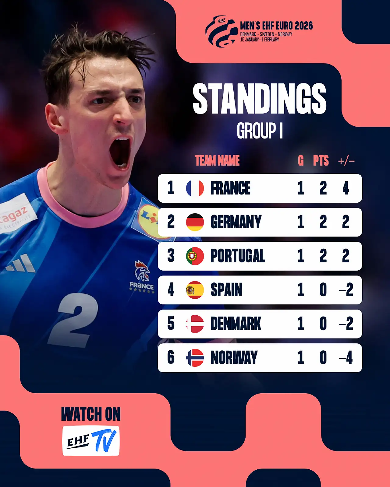 Danimarka, İsveç ve Norveç'in ev sahipliğinde hentbol erkekler avrupa şampiyonası EHF Euro 2026 devam ediyor.