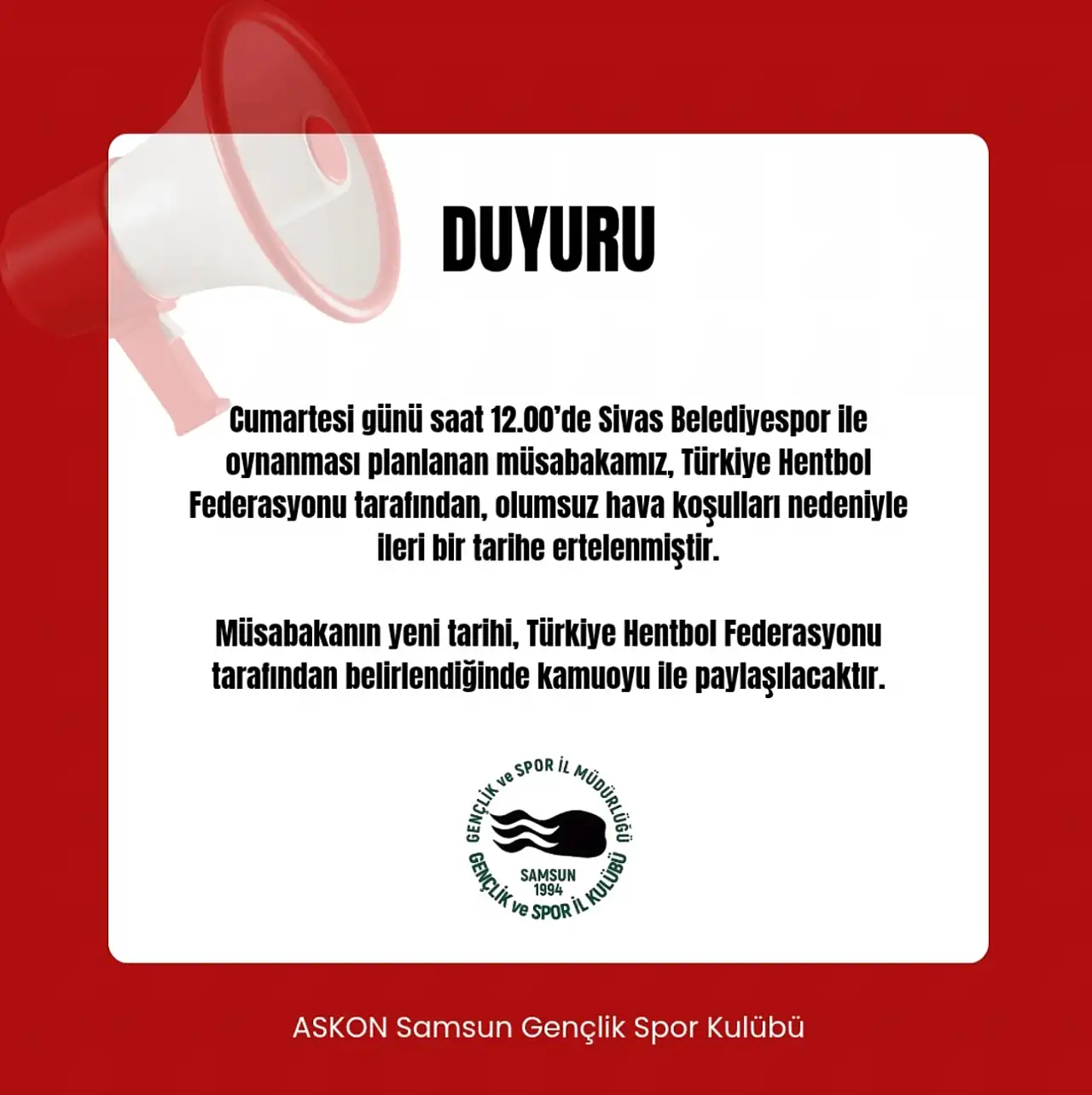 Hentbol Liglerinde bu hafta oynanması planlanan müsabakalar Türkiye Hentbol Federasyonu tarafından olumsuz hava koşulları sebebiyle ertelendi.